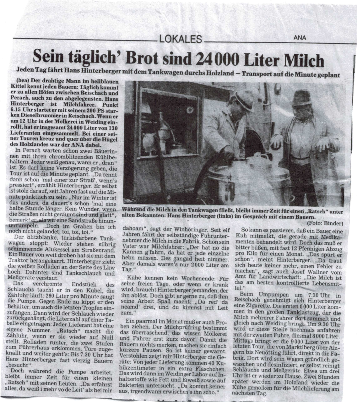Am 1. Oktober übernimmt Johann „Hans“ Junior den Betrieb. Die Ära der Milchkannen geht zu Ende und die Zeit der modernen Tankwagen beginnt. Mit seinem 200 PS starken Diesel-Lkw ist er nun zwischen Reischach und Perach unterwegs. Die Tour ist auf die Minute geplant: Er sammelt täglich 24.000 Liter Milch von rund 130 Lieferanten ein. Trotz des straffen Zeitplans bleibt bei den Stopps immer Zeit für einen „Ratsch“ mit den Bauern, denn der persönliche Kontakt gehört für uns einfach dazu.Platz für Wachstum
